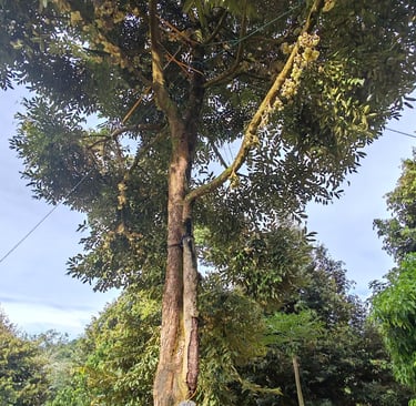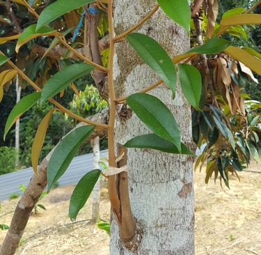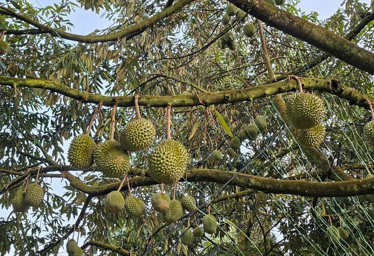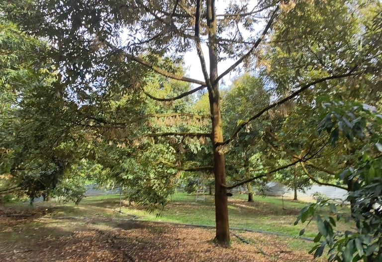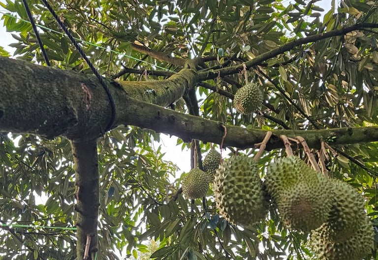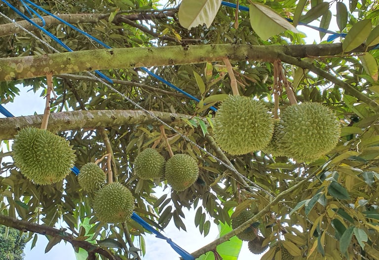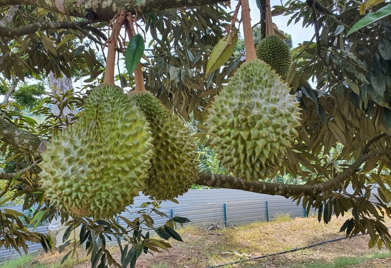 Older durian trees (around 15-20 years old) often produce larger, higher-quality fruits compared to younger ones. Their roots have had more time to spread and absorb nutrients, while their trunks have thickened to support bigger fruit loads.