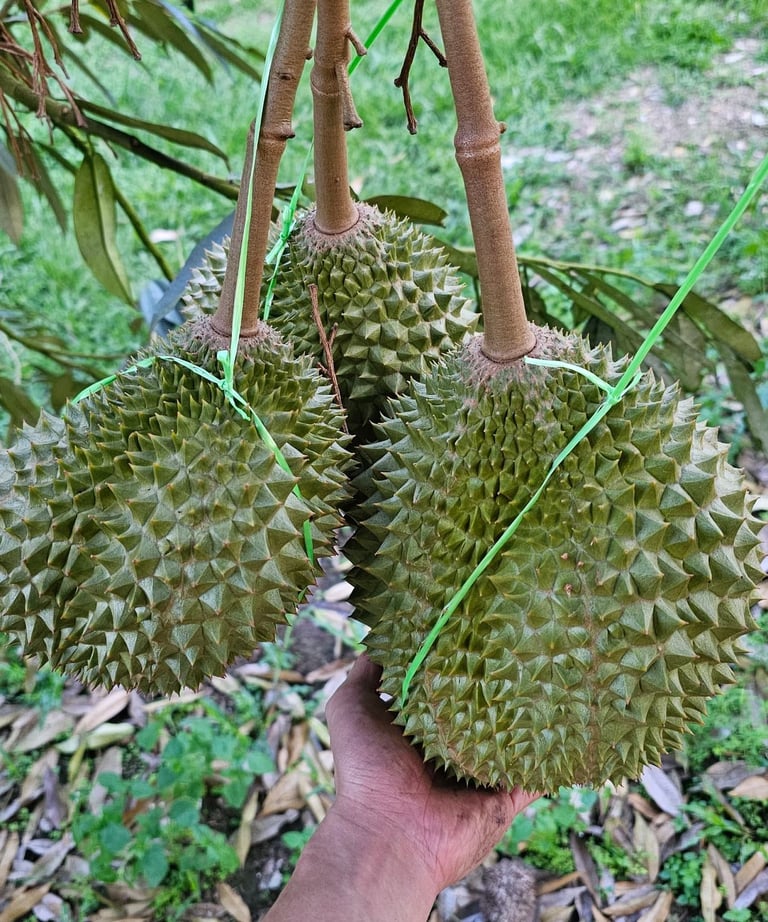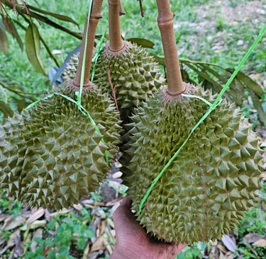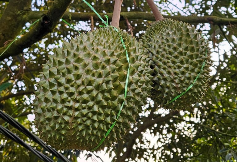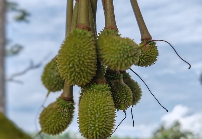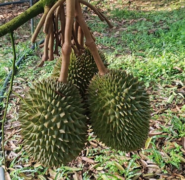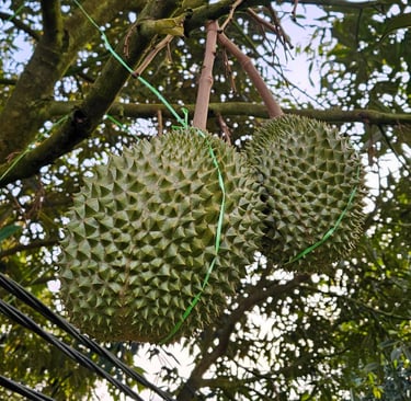While you may be used to seeing a single durian hanging from a branch, sometimes the tree produces multiple fruits in a cluster from the same flower. These clustered fruits are smaller in size, and their flavour is typically more uniform and less intense than single, large fruits.