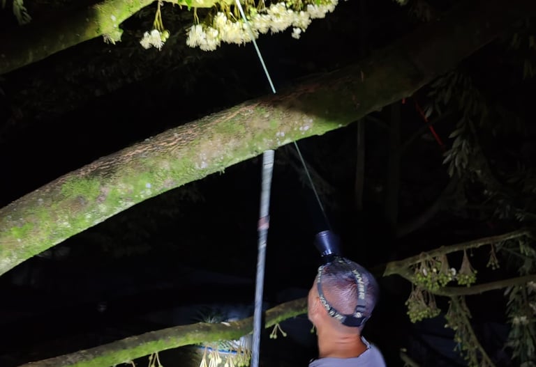 Durian trees rely on bats and sometimes bees for pollination. The flowers open at night and last only a few hours, making the timing of pollination critical. Farmers have to ensure a healthy population of pollinators around their farms, which is why pesticides are carefully managed.