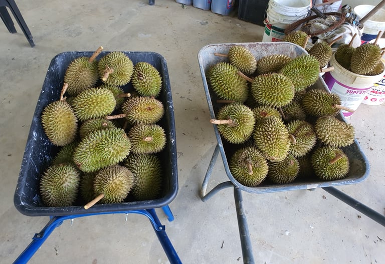 The peak season for durian in Malaysia typically starts in June and lasts until August, but depending on the variety, you can find durians throughout the year. Some varieties may bear fruit during the off-season, creating multiple harvests.