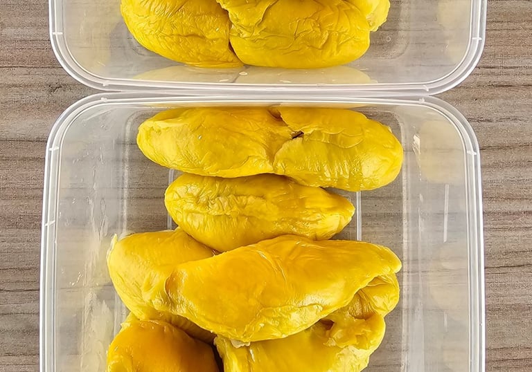 If you’re able to see the durian’s flesh through any small cracks or openings, the color can give you an idea of its quality. Golden-yellow flesh indicates a premium durian, while a pale or off-white color 'could' suggest an immature fruit.