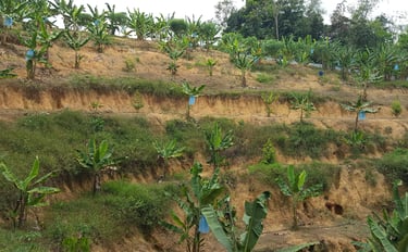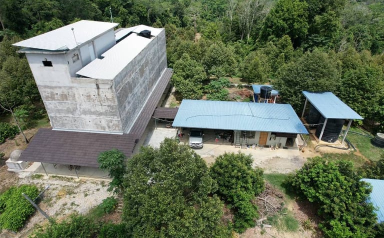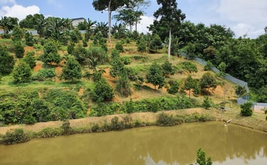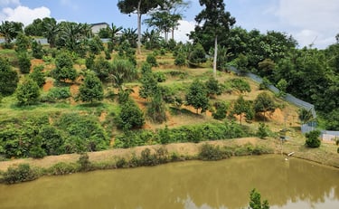 It started with 350 grafted durian saplings, carefully selected and planted into nursery rows. Twenty-six of them were extra special — grafted from 20-year-old mother trees, carrying the legacy and strength of mature durian genetics. Anticipating future droughts and knowing durians take up lots of water, Mr. Wong oversaw the digging of a pond at the base of the hill to ensure a reliable water source. They built their first worker's quarters, and to support monthly operations, the Wongs planted bananas and papayas — quick fruiters that would soon help fund the long wait for durian maturity.