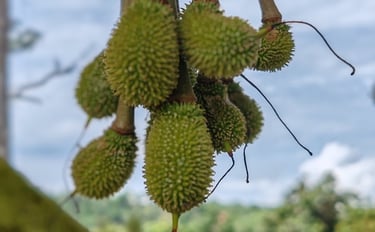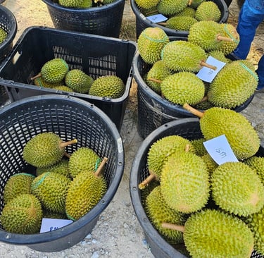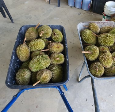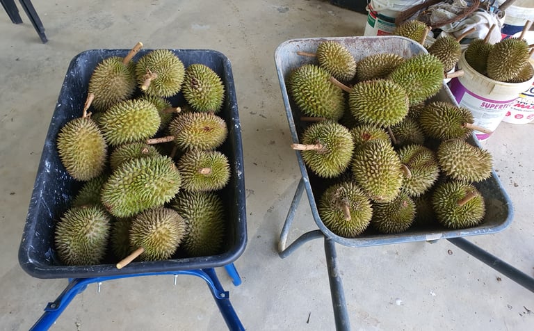 Seven years in, the hillside finally bloomed with promise. Under balanced rains and golden sun, five durian varieties ripened: Musang King, Black Thorn, Tekka, D24, and Green Skin. It was the first proper durian season, and it came with all the glory and gratitude of hard-work. The trees had matured, the flavors had deepened, and the harvest was more than a milestone — it was a moment of quiet triumph.