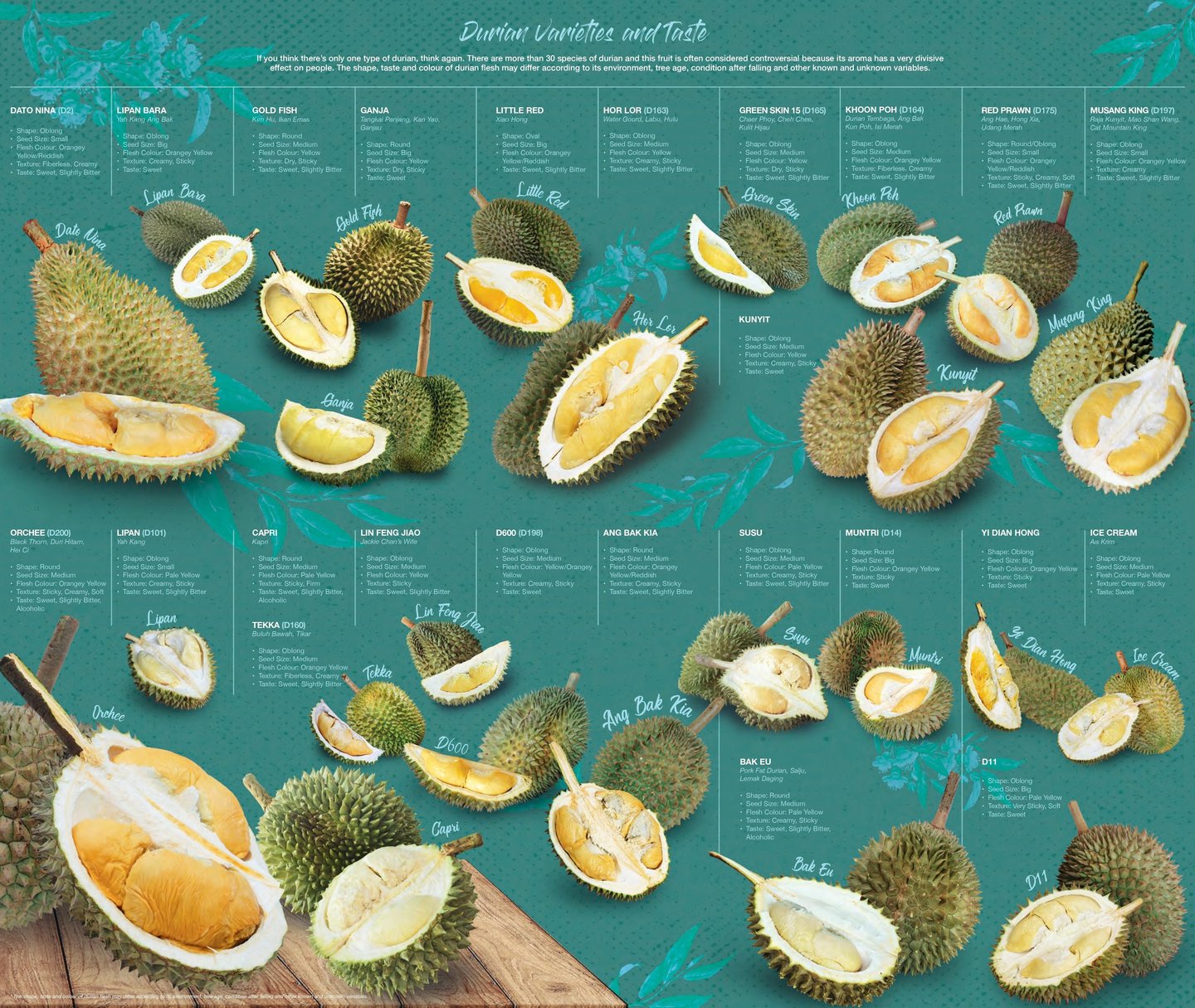 Durian, Malaysia’s crown jewel, is a fruit of many faces—each breed has its own unique shape, taste, and aroma.